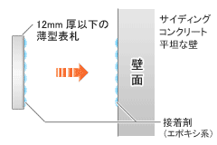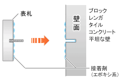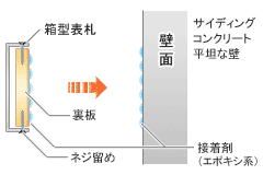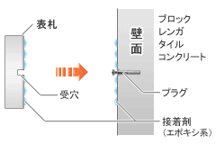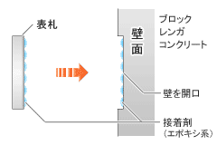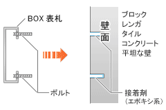 BOX表札には接着面がありませんので、壁面に電動ドリルでボルト穴を開け、ボルト穴にボンドを流し込みボルトにもボンドを塗り圧着します。