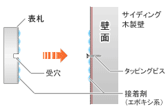基本的にはビス留め取付け 1 と同じですが、サイディング、木製壁に取付ける場合は壁に直接タッピングビスを締めます。ネジ穴から壁の内側に水が染込み、腐食する事を防ぐ為に表札固定後に表札の外周をコーキング処理します。